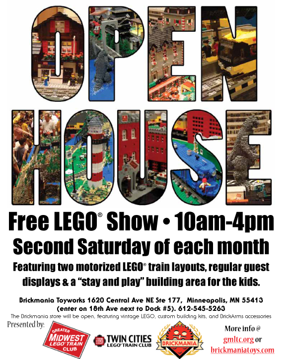 On March 10, Brickmania Toyworks will open its doors to the public for a free open house from 10 AM to 4 PM. The open house features two large, running LEGO® train displays and an always changing selection of guest displays. We also have a play area with bricks for building, a race car ramp, and other creative activities depending on volunteers.